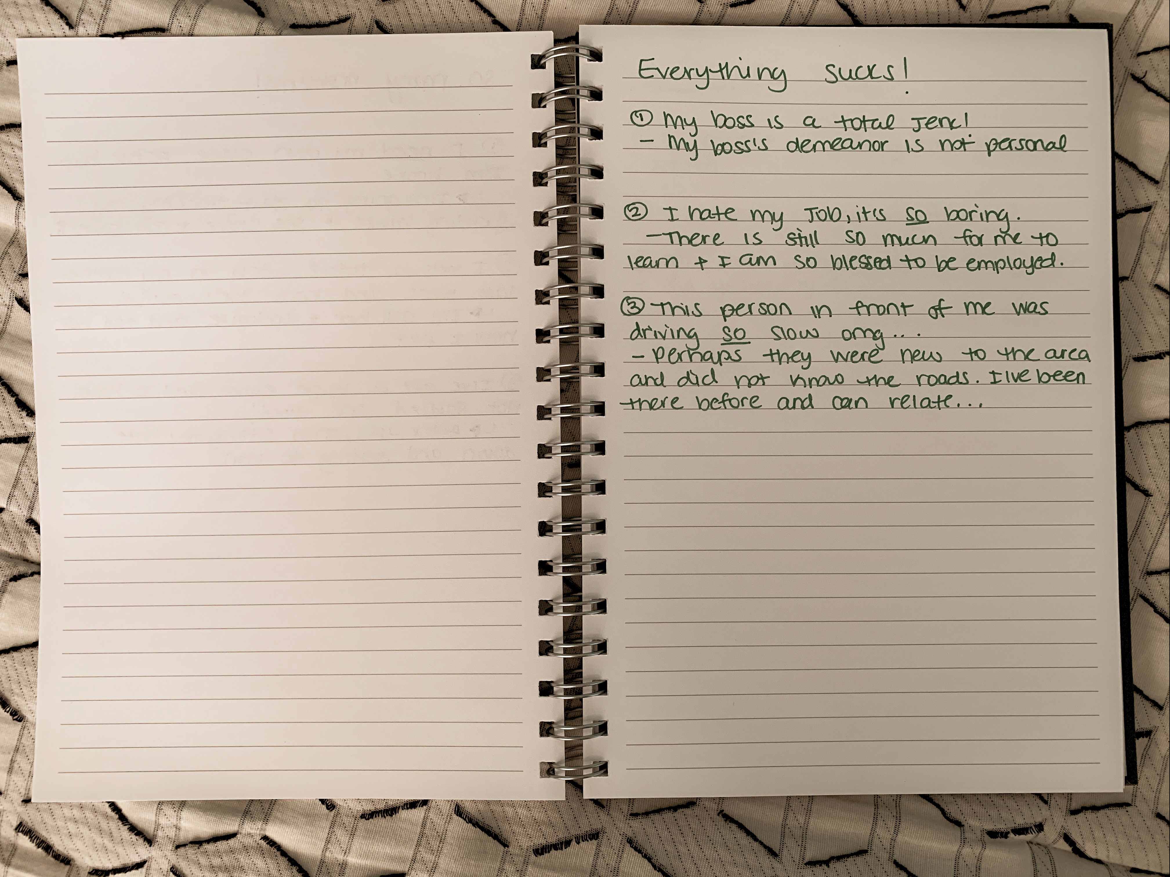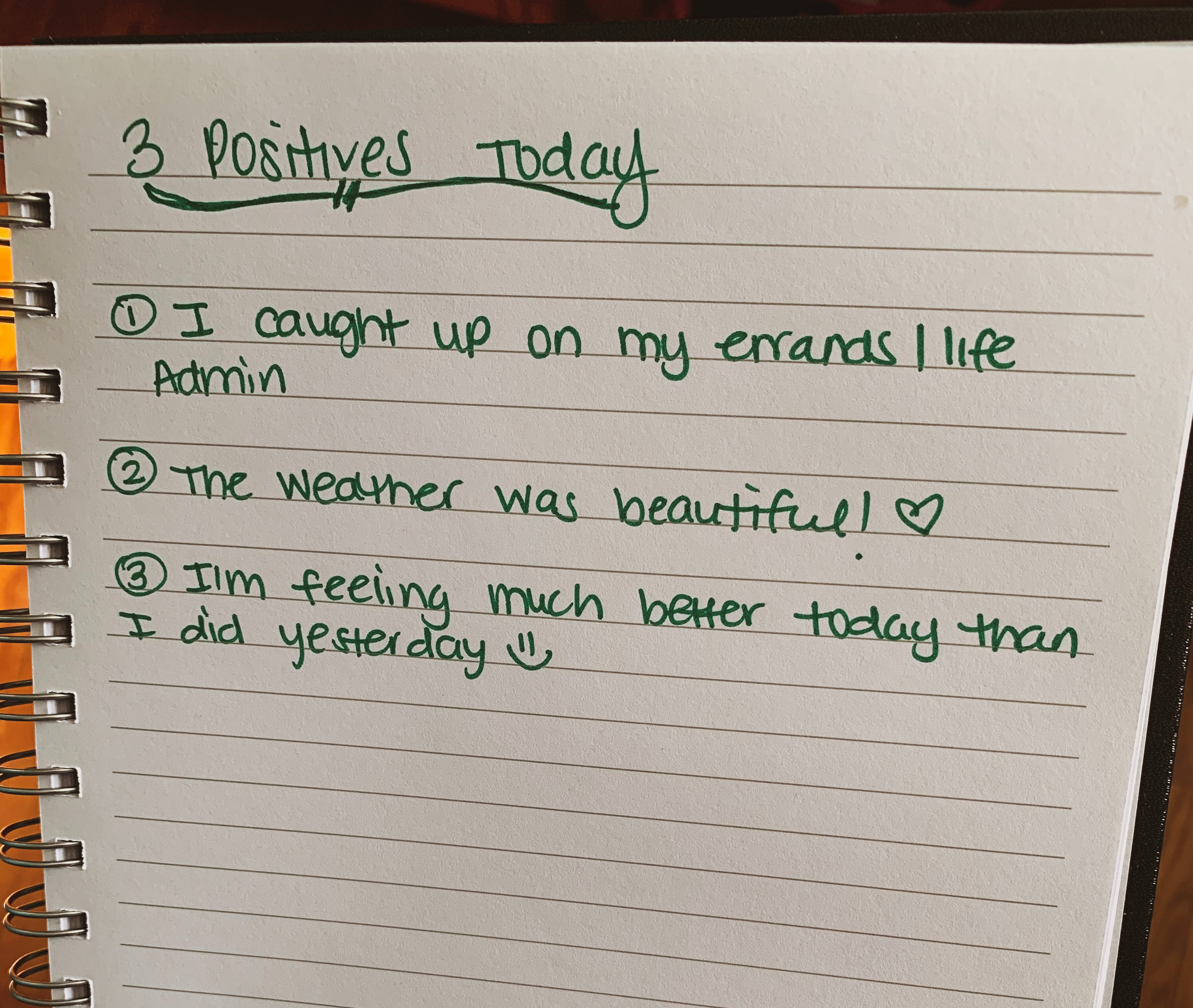 Gratitude is an increasingly popular topic. Nowadays, everyone wants to practice gratitude, which is AMAZING. Gratitude is all about appreciation of your life and existence as is. There are many gratitude journals out there, but I like to keep it simple by listing all of the positives of the day in free-form (i.e. without prompting). If there don’t seem to be many positives in that moment, I list the first 3 that come to my mind. These can be as big as getting through a big presentation at work, or as “small” as having running water to brush your teeth this morning. I love to pair this with the “I just need to vent” entry because that way, I can acknowledge that the good things in my life do coexist with the “bad” and that is perfectly okay.