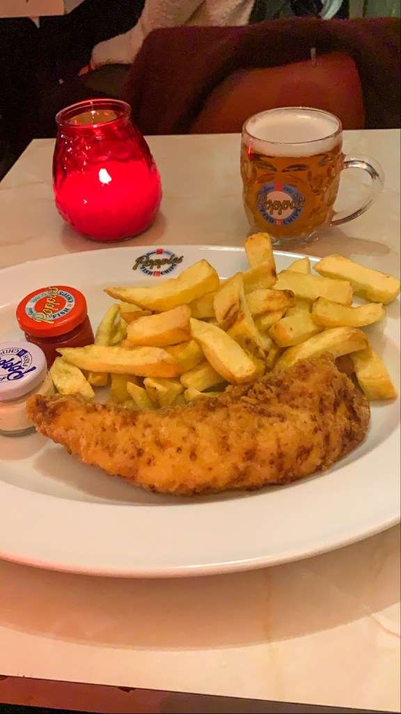 - Dinner: Poppies Fish and Chips – I personally prefer fried catfish over cod or haddock, but I had to try it anyway. They claimed to be the best fish and chips in London. Maybe, maybe not. In my opinion, the experience was bland and needed seasonings on both the fish and the chips.